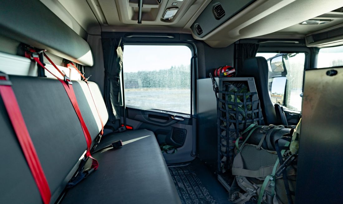 Kabina vozidla vychází z osvědčeného konceptu Scania CrewCab, známého z hasičských a záchranných vozidel. Umožňuje přepravu celé posádky tanku včetně osobní výzbroje a výstroje, která tak dorazí na místo společně s technikou a může okamžitě zahájit plnění úkolů. Pro zvýšení flexibility lze převážet i dva dodatečné kontejnery, což zjednodušuje logistiku a snižuje počet přesunů jinými prostředky.